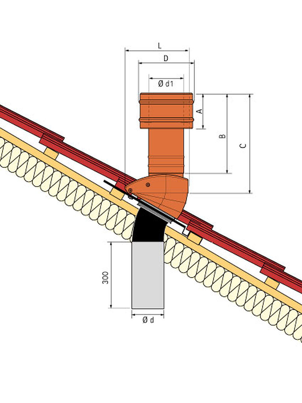 mit Grundelement, ausgebildet als Universal-Pfanne, alternativ zur Aufnahme einer Original-Dachpfanne, bauseits nach Wahl. Flexibler Anschluss, durchgehend isoliert, mit Dichtmanschette zur Abdichtung der Unterspannbahn. Anschlussrohr Stahl 300 mm lang für Dammdicken bis 200 mm. Verlängerungsschiebestück Typ VLL für Dämmdicken bis 400 mm als Zubehör erhältlich.